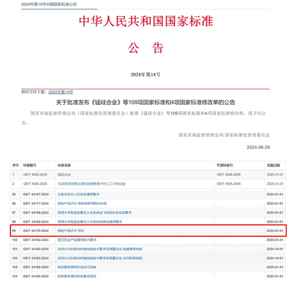 随着国家对生态文明建设的高度重视和“碳达峰、碳中和”目标的深入实施,绿色建材的发展迎来了新的春天!2024年6月29日,GB/T 44178—2024《绿色产品评价 石材》国家标准正式发布,并将于2025年1月1日起正式实施。